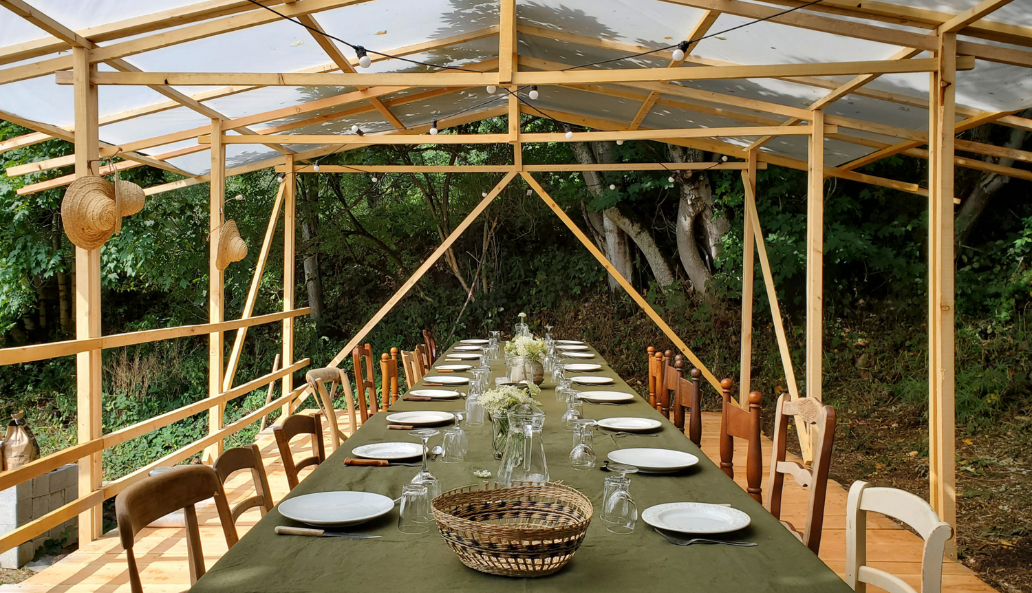 Le programme de ce petit projet était très simple : concevoir et fabriquer rapidement un espace de réception estival provisoire destiné à accueillir un évènement ponctuel et le construire avec un stock de bois destinés à être ré-employés après un démontage à la fin de l'été.